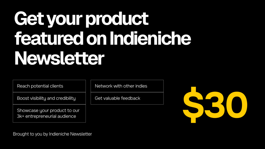 We will feature your product in our indieniche newsletter as the product of the week for that issue. This will help you ✅ Reach potential clients ✅ Boost visibility and credibility ✅ Showcase your product to a targeted audience ✅ Network with other indie hackers ✅ Get valuable feedback from experienced founders