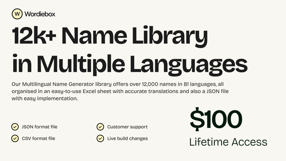 Our Multilingual Name Generator library offers over 12,000 names in 81 languages, all organized in an easy-to-use Excel sheet with accurate translations and also a JSON file with easy implementation. Whether you're a writer, parent, developer, or anyone needing diverse and authentic names, this tool is designed to meet your needs.
